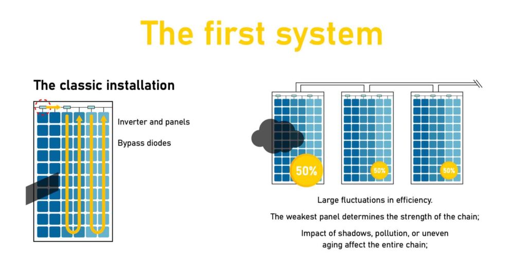 When solar panels first hit the market, the technology was simple but also somewhat problematic. Early solar panel systems were connected in series, much like Christmas lights. While this setup was a breakthrough at the time, it had a significant flaw: if one panel in the string malfunctioned or shaded, it would affect the entire system. In other words, if you had a defective panel, your whole solar system could stop generating energy, much like how one faulty bulb could darken an entire string of Christmas lights.
